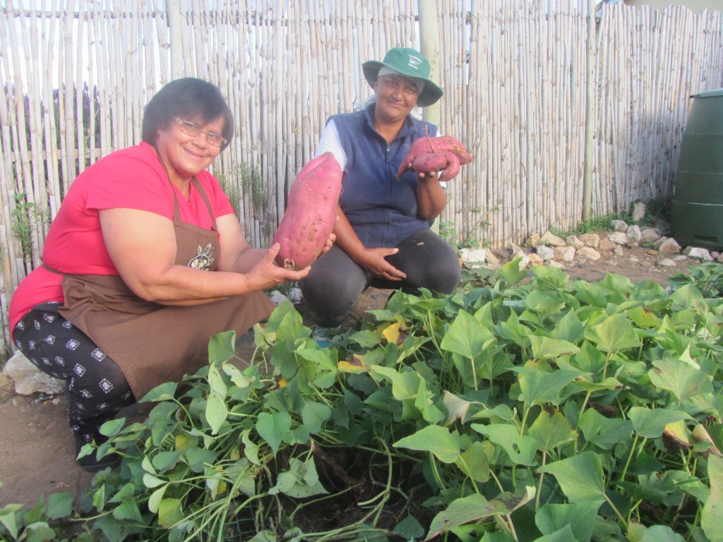 Post pandemic in 2022, taking on board our research findings, we started a small-scale food growing trial in boxes. This work was in collaboration with Hermanus Rainbow Trust and funded through the Utopia Foundation. In partnership we ran two training programmes which included making food growing boxes from reclaimed wood, how to prepare soil and growing organic food. The training workshops took place in Melkhoutfontein with the Hermanus team staying with Dreamcatcher Homestay Kamammas and enjoyed local Kamamma food. After the training programme the Hermanus Rainbow Trust returned to Hermanus to work on their own food growing project.