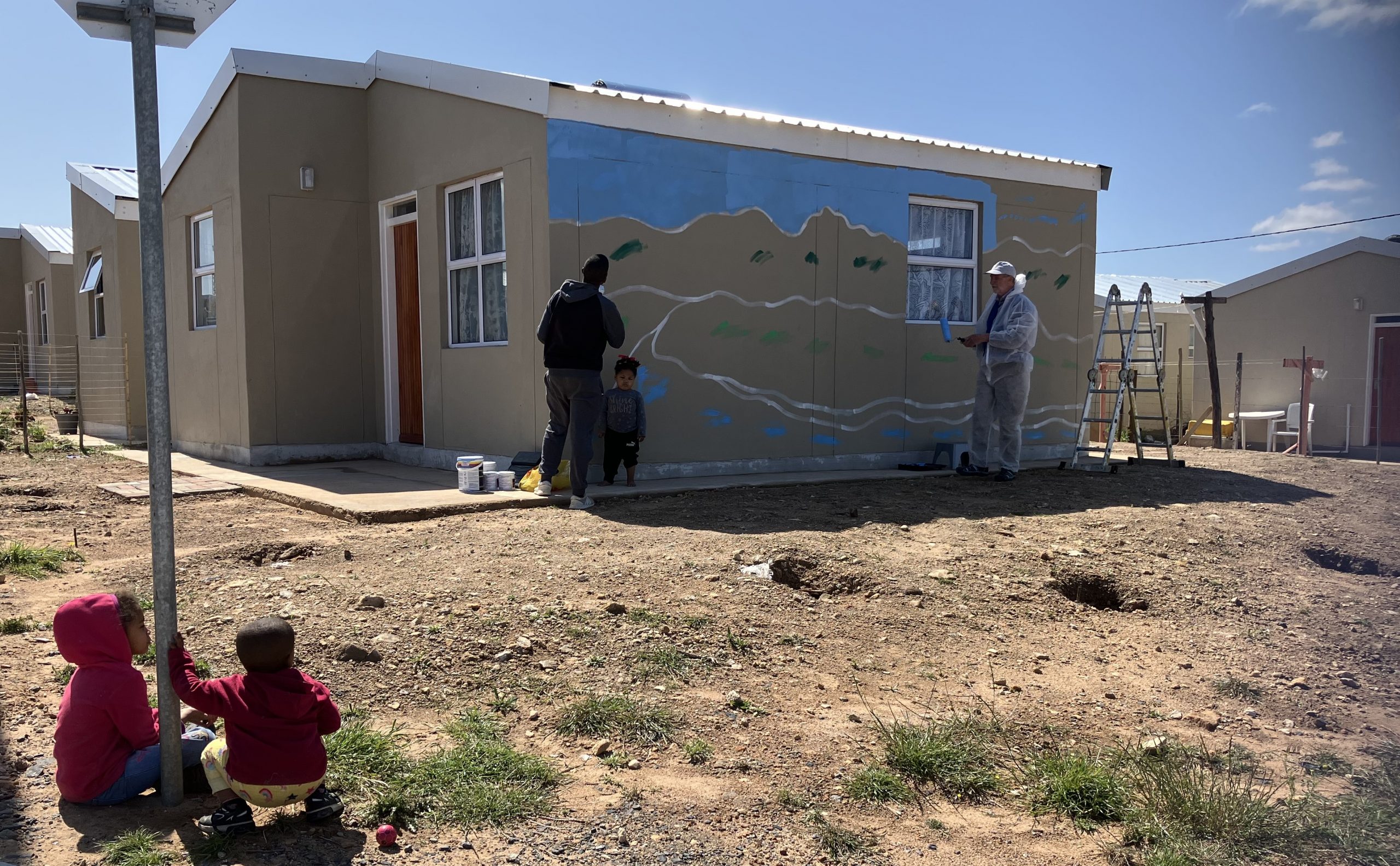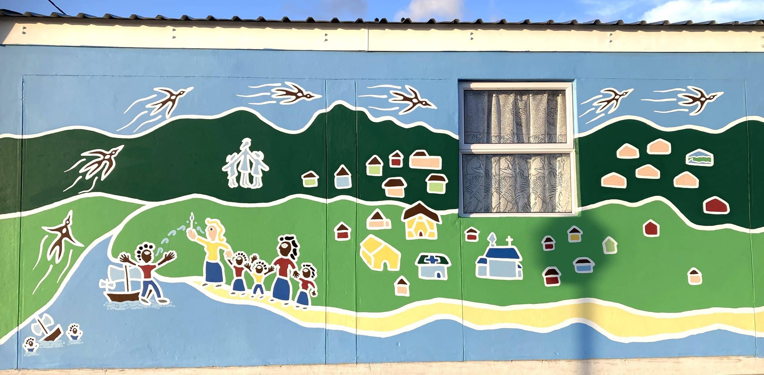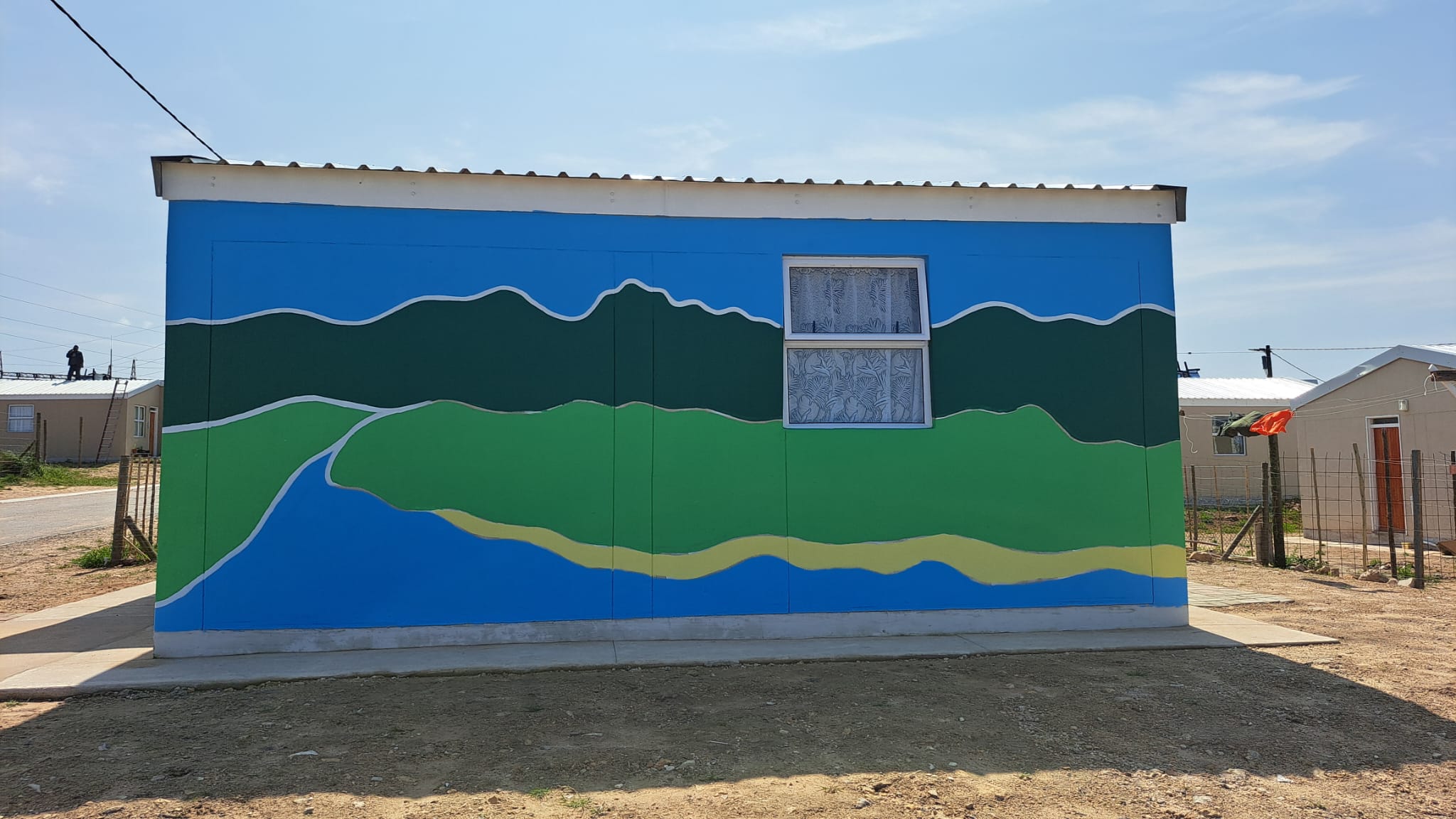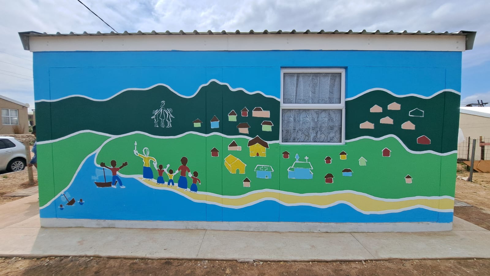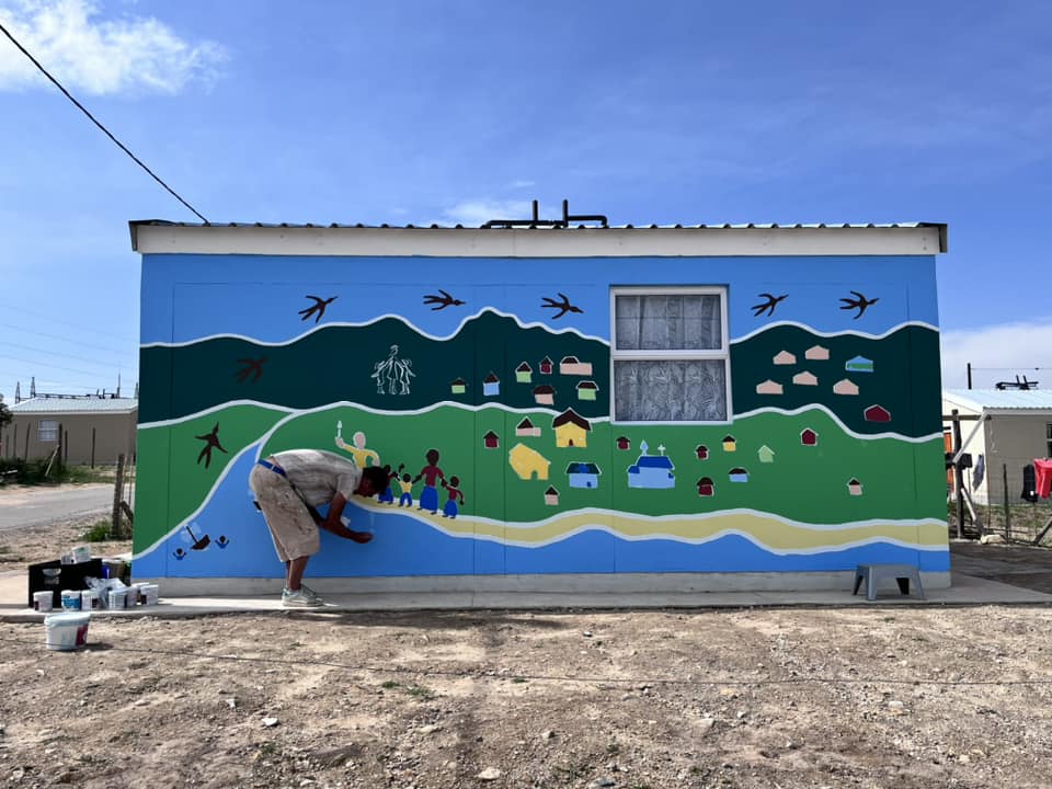 Painted in 2024, this is the second mural in the new housing development and is a reimagining of the Timewalk from Blombos to Melkhoutfontein mural which was one of the first painted under the project. The mural depicts key events in the development of Melkhoutfontein and environs and Dreamcatcher.