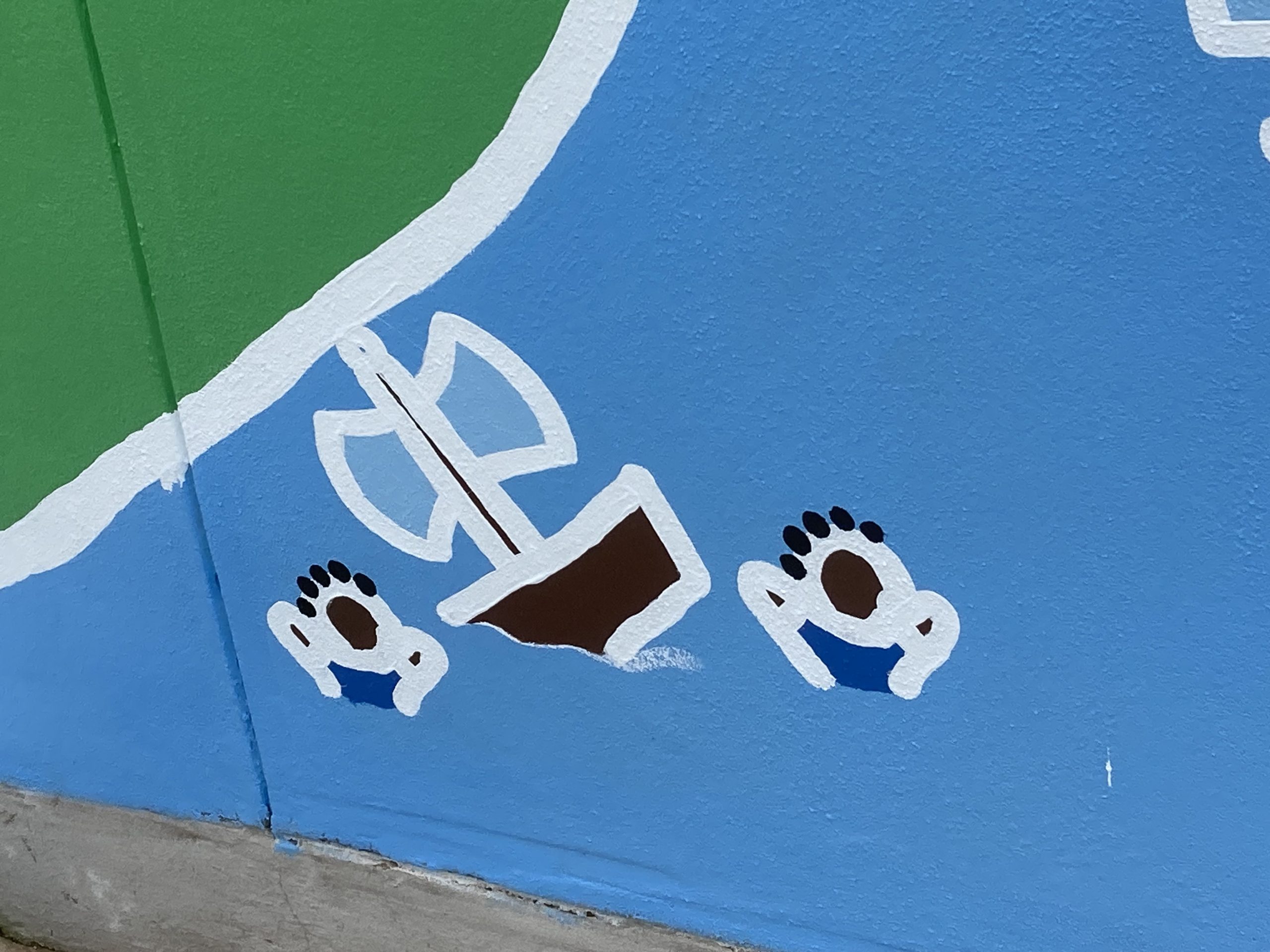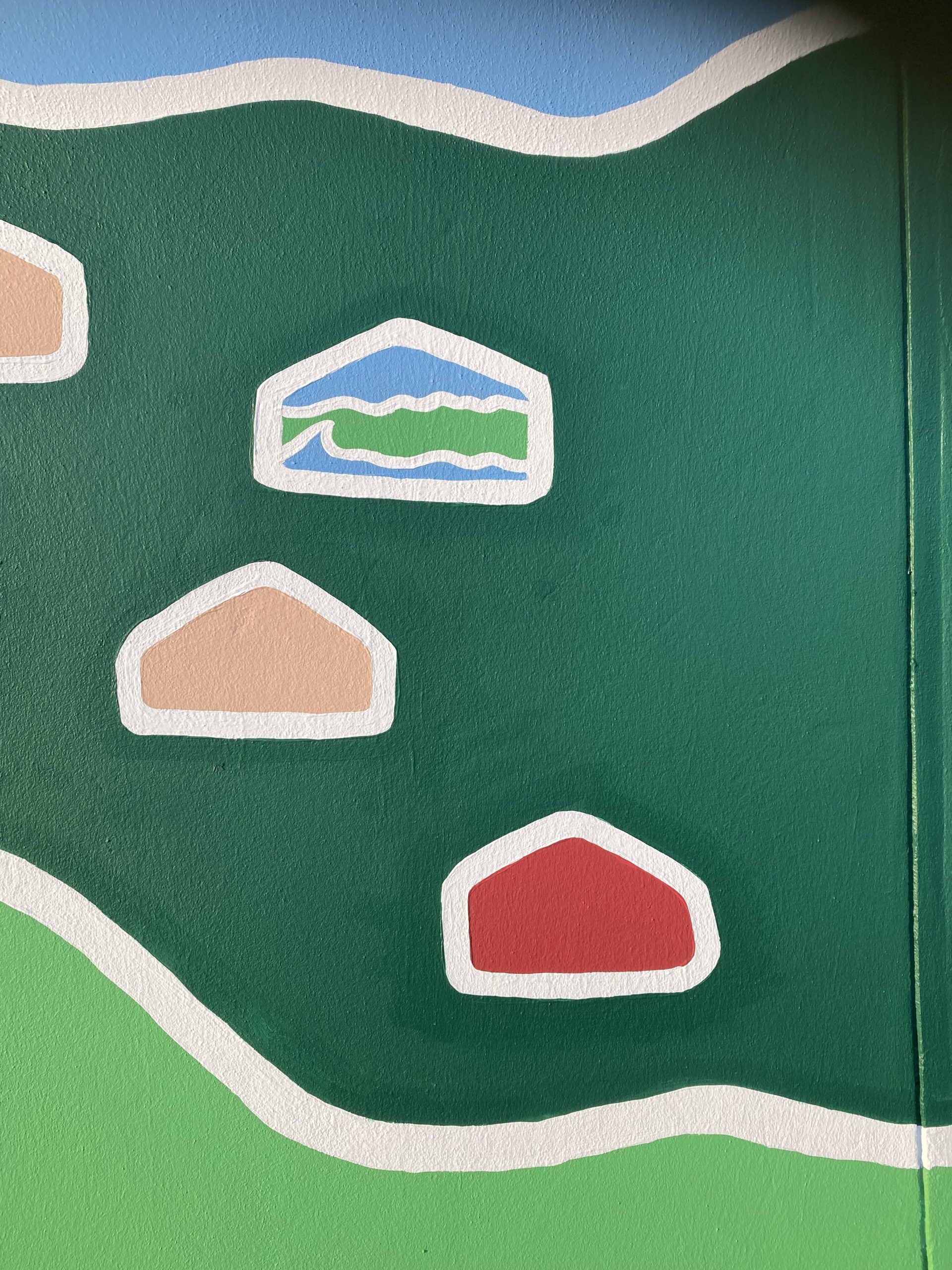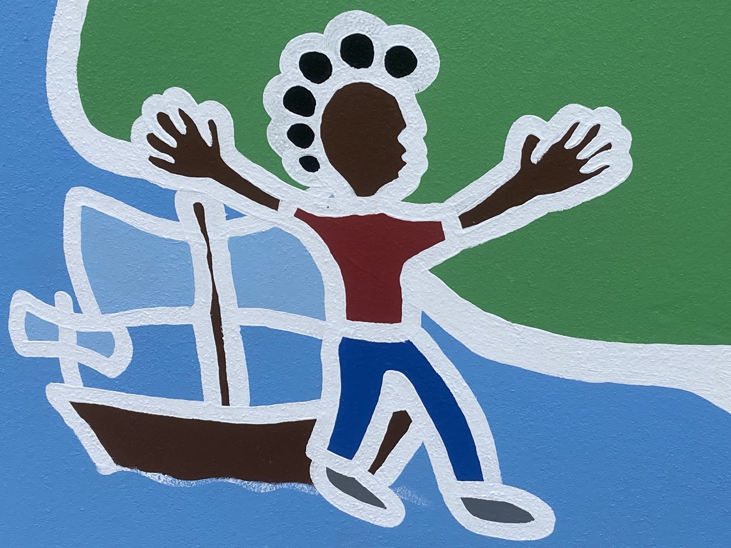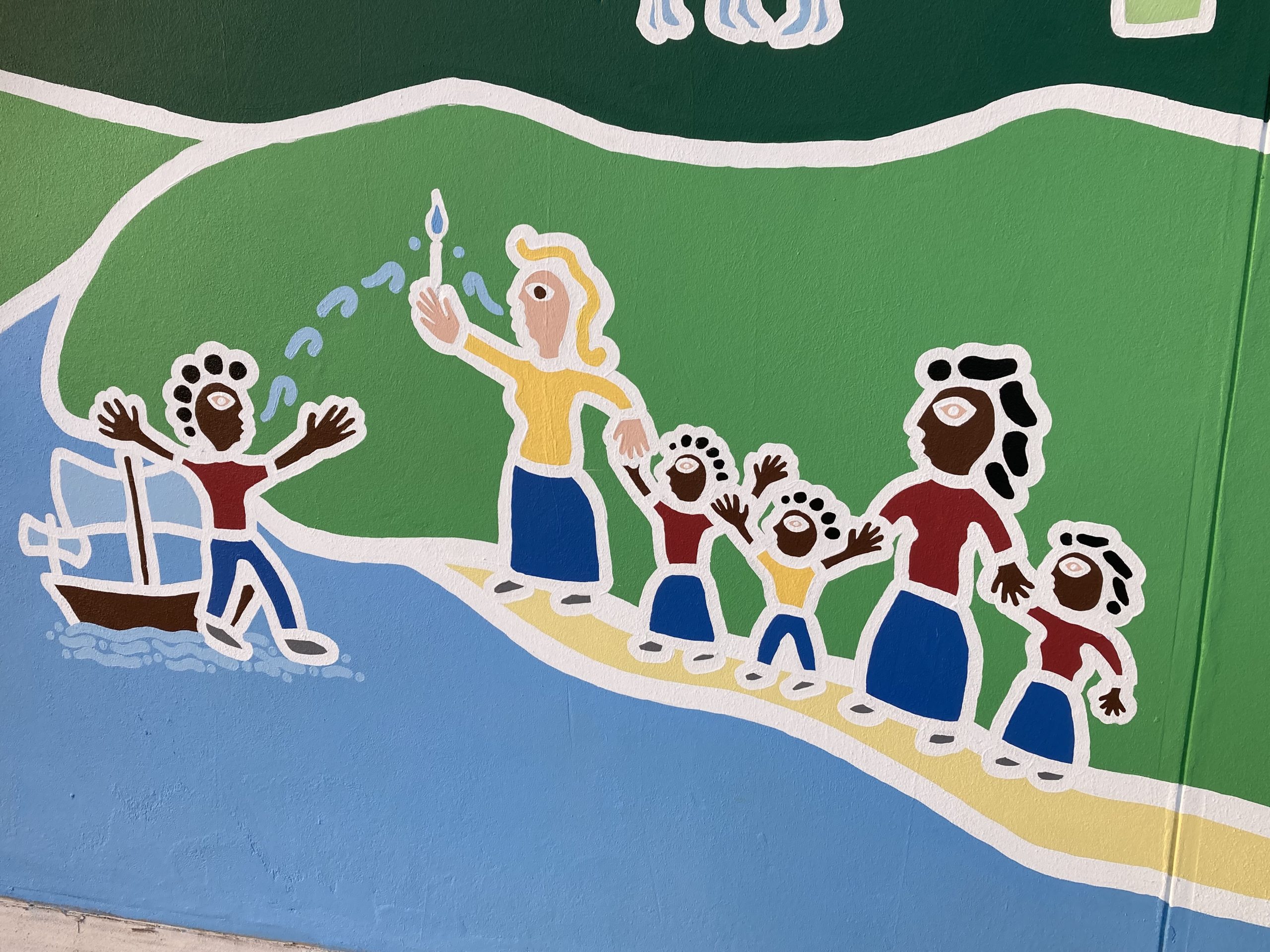 Painted in 2024, this is the second mural in the new housing development and is a reimagining of the Timewalk from Blombos to Melkhoutfontein mural which was one of the first painted under the project. The mural depicts key events in the development of Melkhoutfontein and environs and Dreamcatcher.