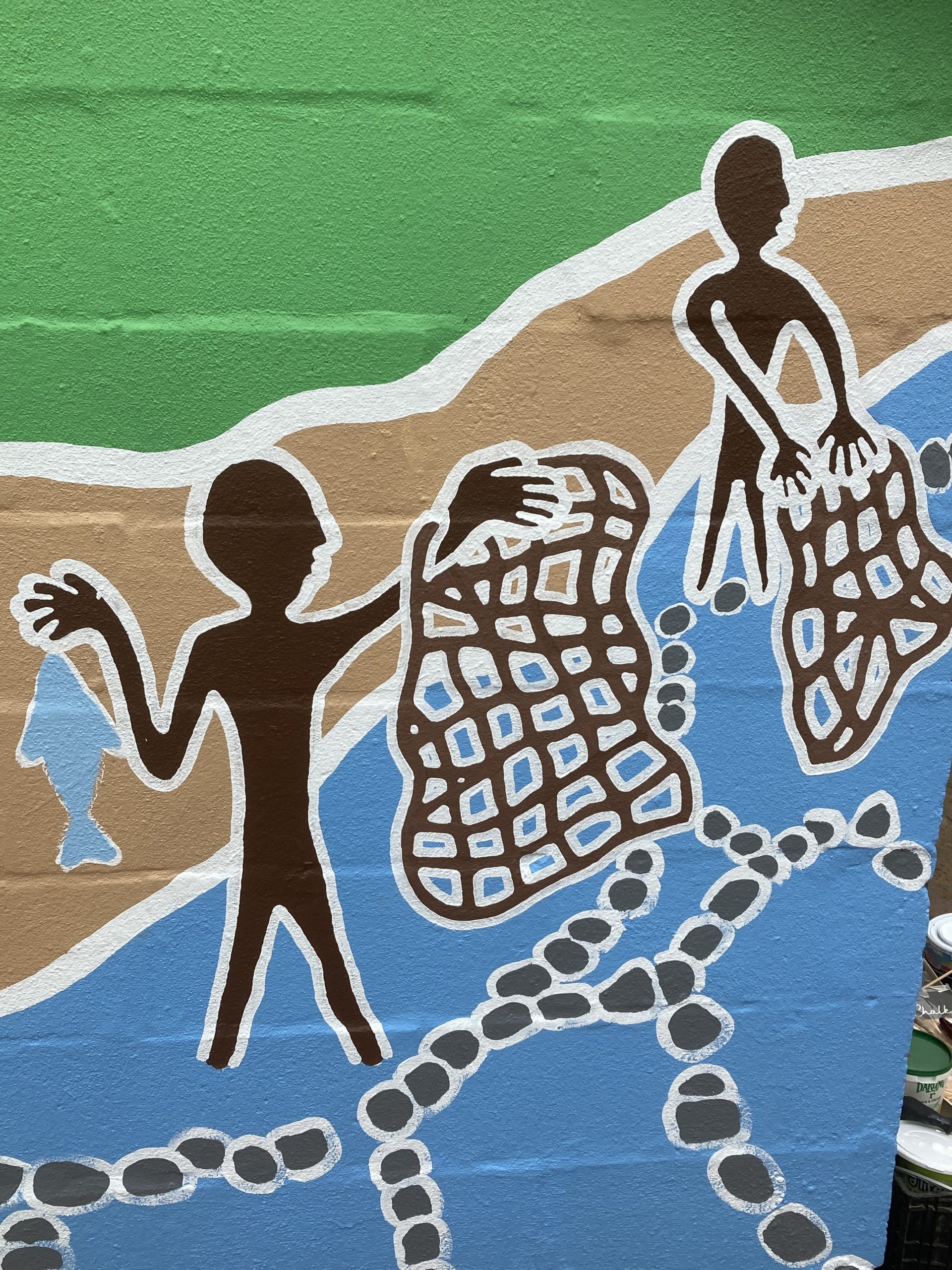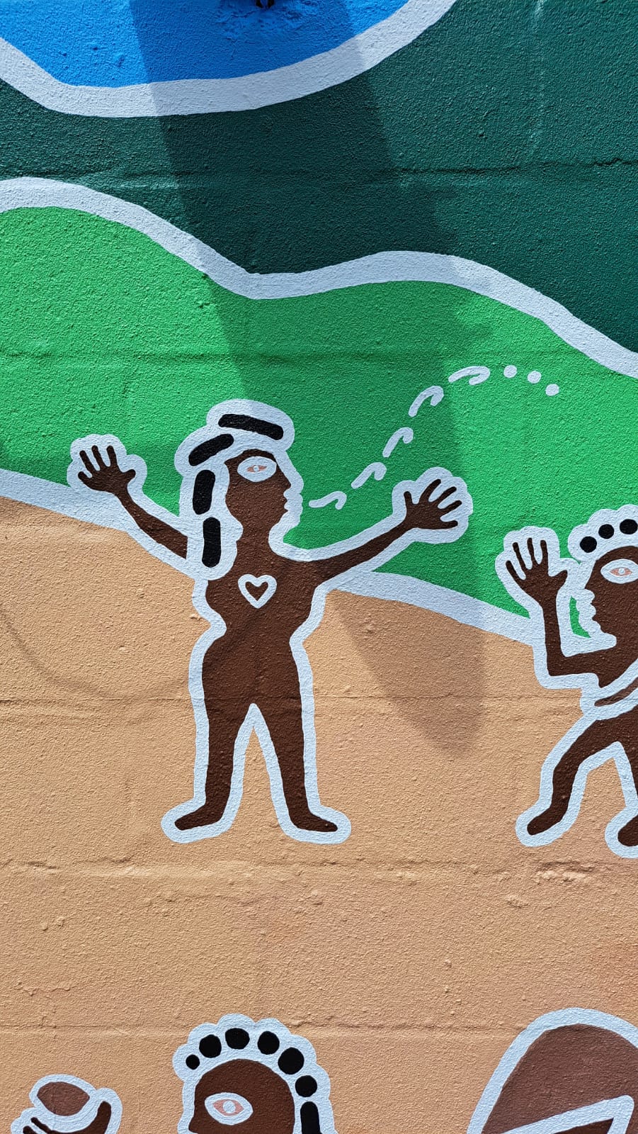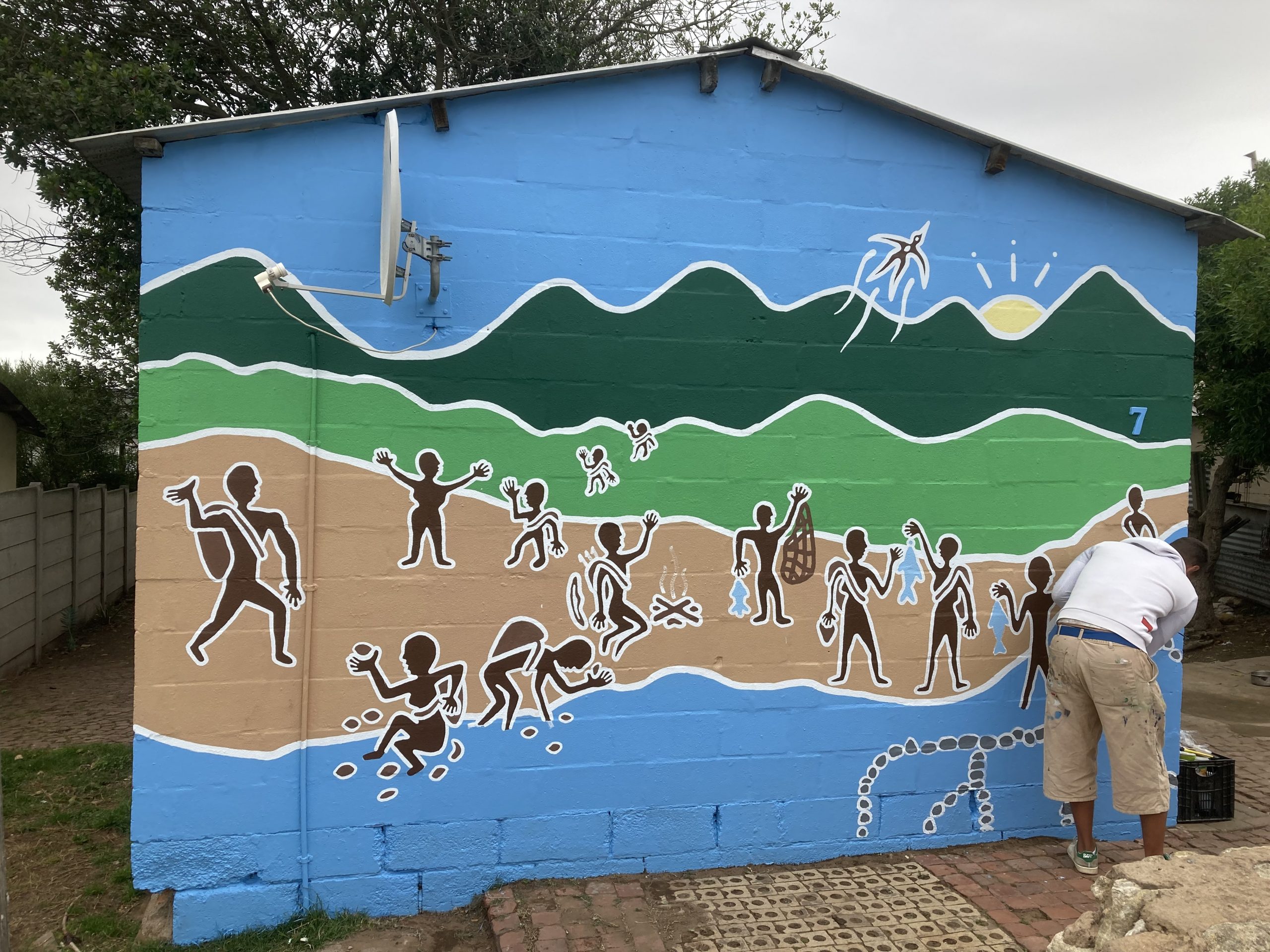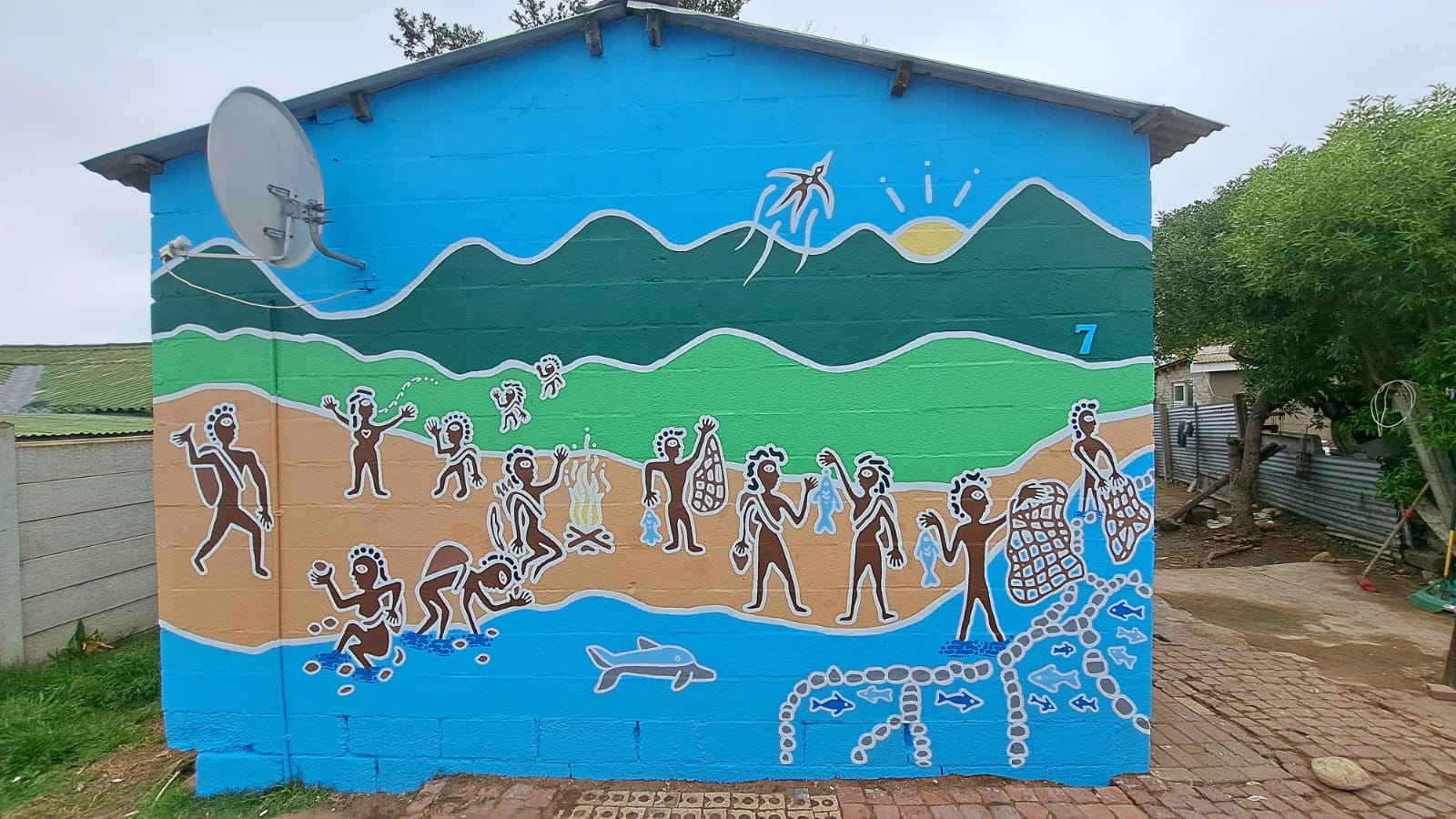 This 2024 mural is a reimagining of the “Strandlopers” first painted in 2016, designed by long-term Dreamcatcher collaborator Bruce Rimell. It pays homage to the Strandloper Khoi and to the nearby ancient fish traps, which are declared a national heritage site.