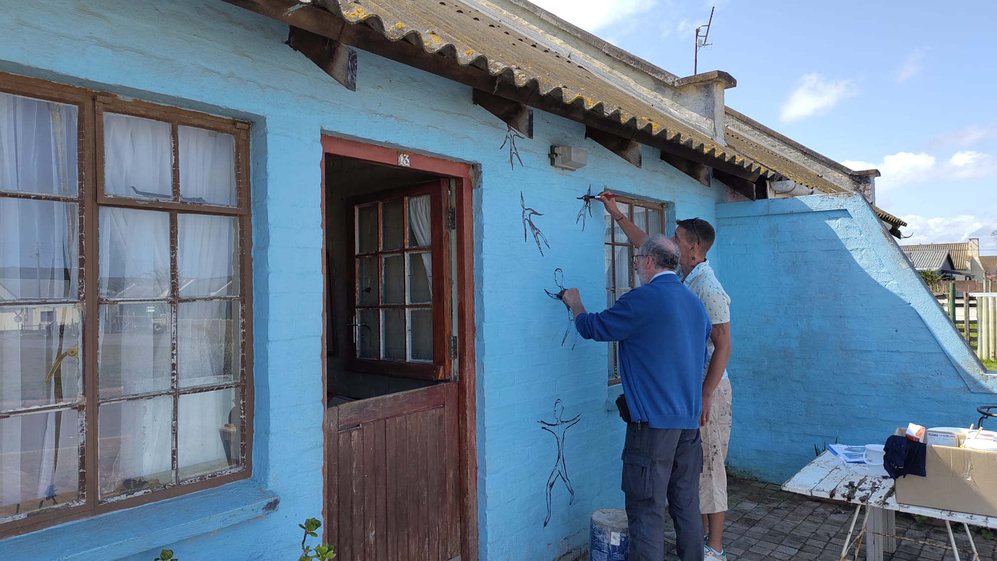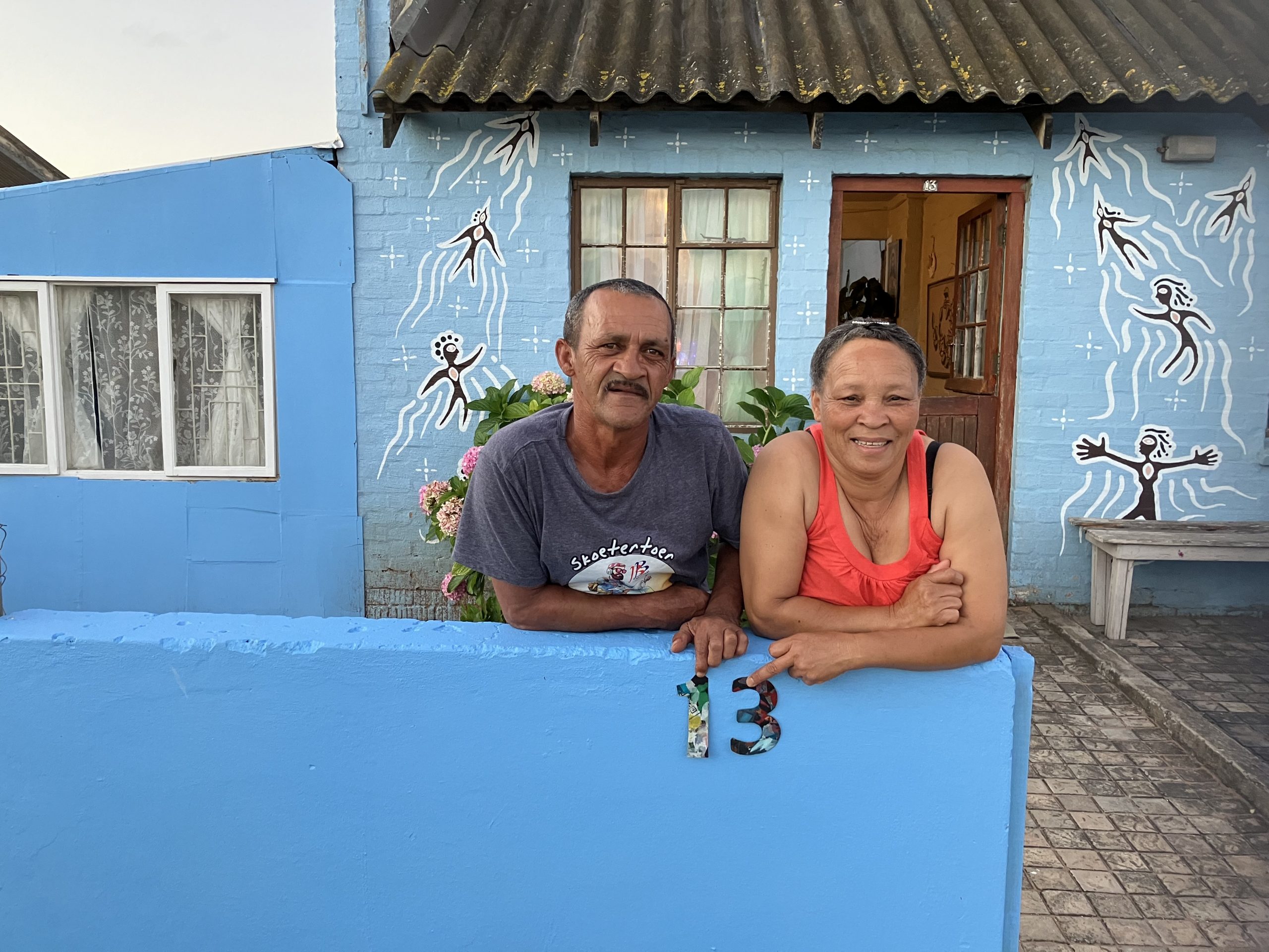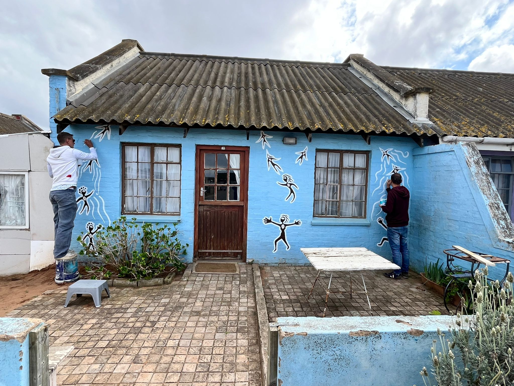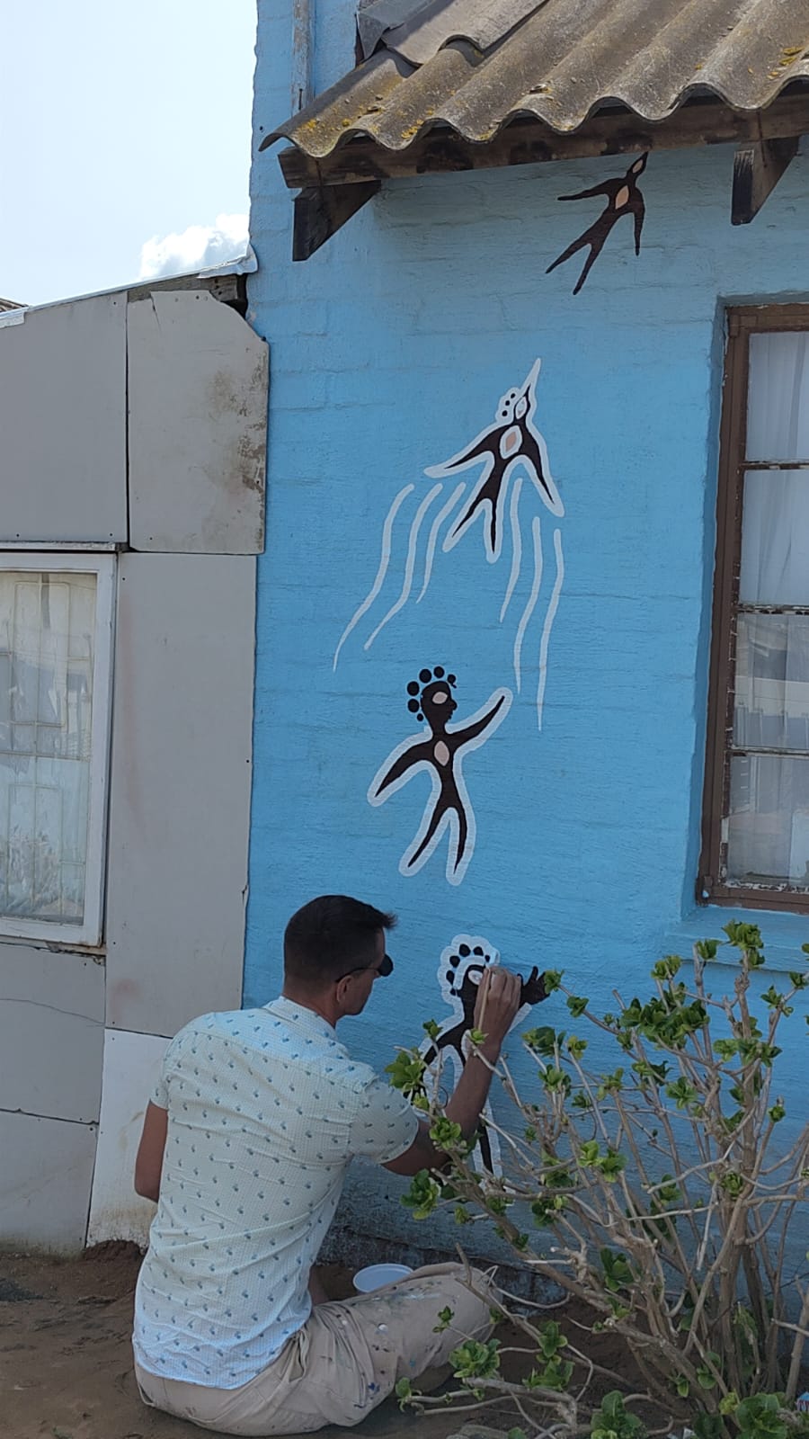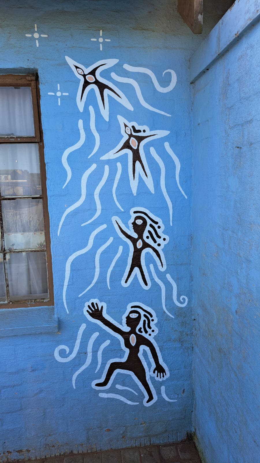 Like several of our murals, it pays homage to community ancestry, drawing on ancient rock art that depicts people transforming into swifts (swaweltjies). In ancestral traditions, people would dance and imagine becoming swifts as part of their spirituality and healing. Swifts were revered for their skill in flight, and at the changing of the seasons, ancestors would migrate — from the Klein Karoo to the coast, including the Blombos Cave near Melkhoutfontein. The mural captures this legacy: ancestors turning into swifts and ascending into the stars. It also symbolises a deeper message — a collective hope for transformation and renewal within the community.